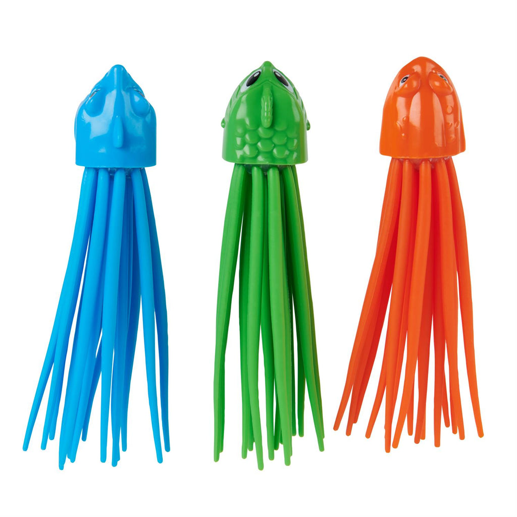 SwimWays SquiDivers are soft and flexible learn to swim dive toys that wiggle and jiggle their way to the bottom of the pool landing nose down. The soft, flexible tentacles float upright making these brightly-colored dive toys easy to see and grab for kids. More advanced swimmers can use their fingers to grab the dive toy by the nose. Great for pool parties too - kids can play with Squidivers at the party and take it home as a party favor to enjoy all summer long. Winner of the Parents' Choice Fun Stuff Award! Three SquiDivers per pack. For kids age 5 and older.