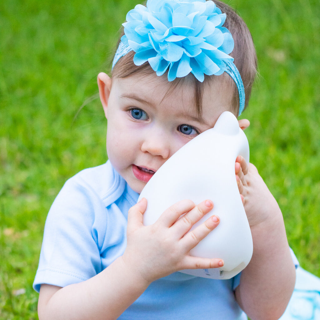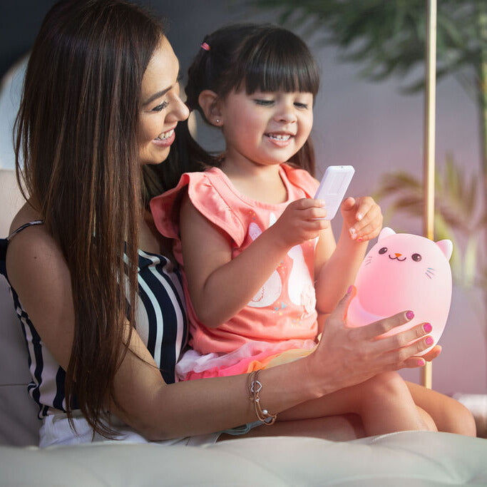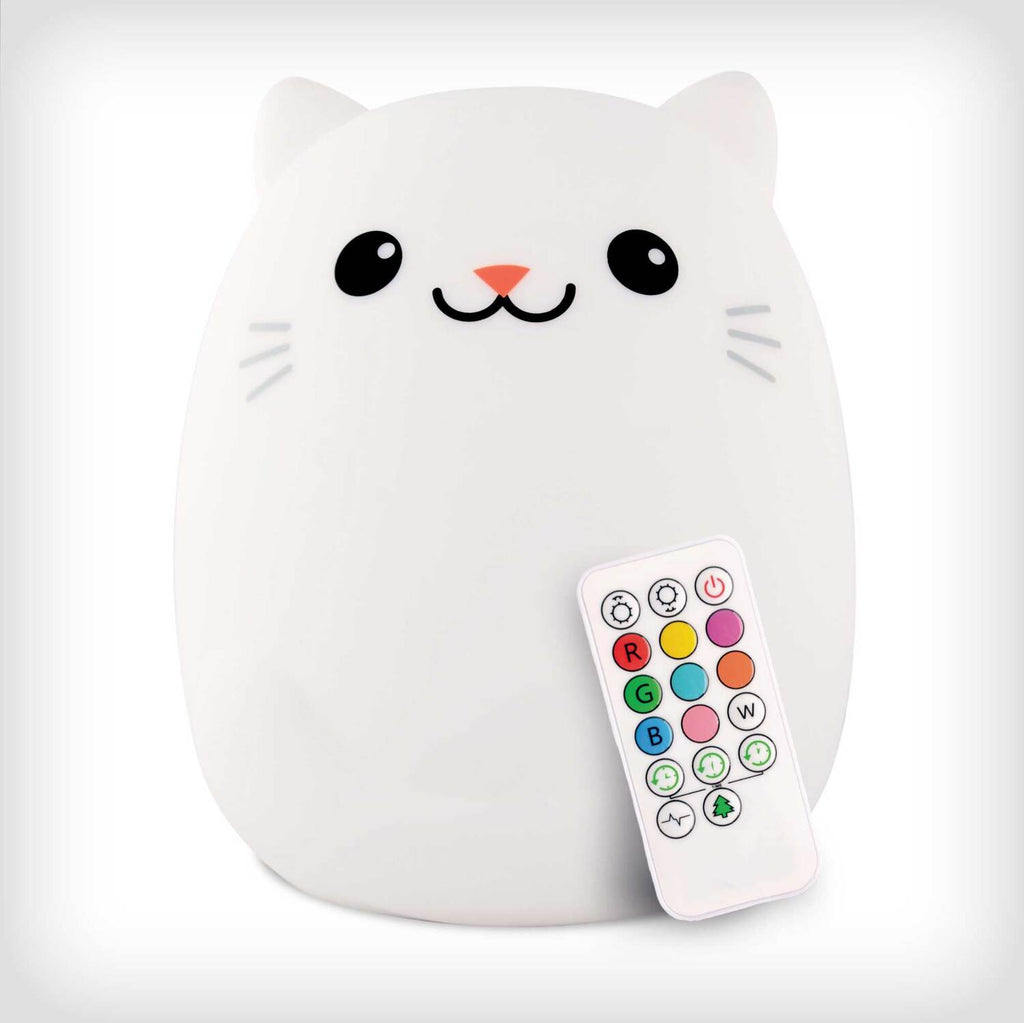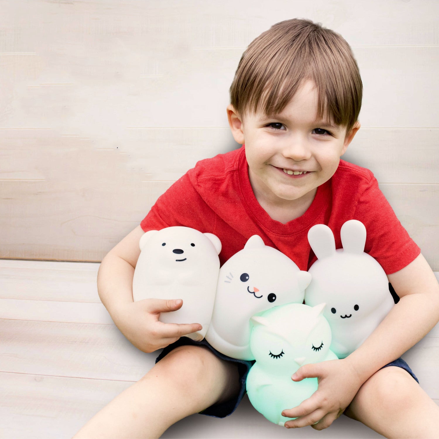 Give your sleep buddy a tap to toggle through 9 soothing, glowing colors. Rechargeable, travel-friendly and safe because the high-quality silicone stays cool. Comes with remote. Night Night!