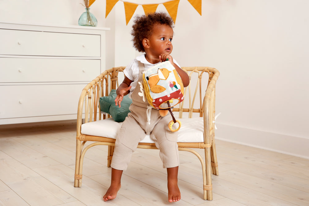 Soft Activity Cube for playful discovery. It's a developmental toy with a variety of fabrics that offers different textures and colors. The Soft Activity Cube encourages hand-eye coordination and motor skills. Include rattle, crinkly fabrics, and a mirror to discover his reflection. Perfect for babies who are 6 months of age.