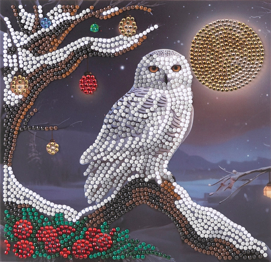 Under the Frosted Moon, a watchful snowy owl perches quietly on a tree branch she’s adorned with festive Christmas ornaments. With the soft glow of moonlight reflecting off the snow, this whimsical scene captures the magic of the season where nature and holiday cheer come together.