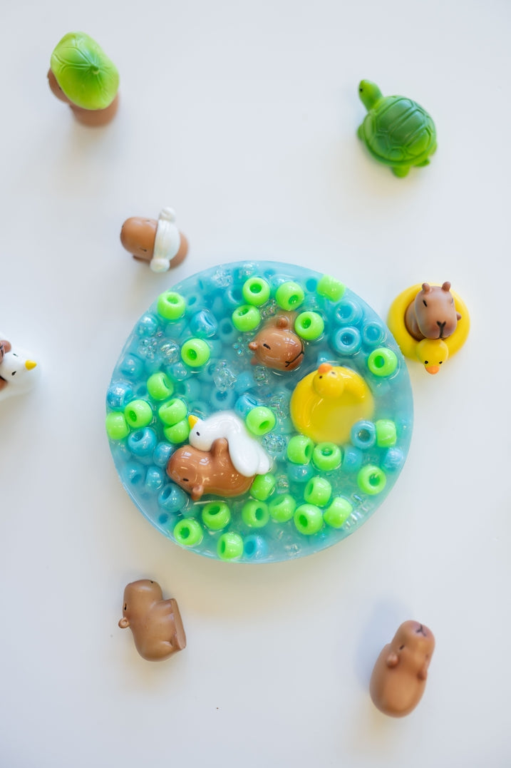 Join the capybaras as they relax in their favorite place—their peaceful pond—on this charming capybara-themed picking pad!
