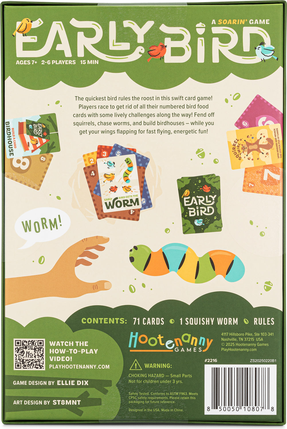The quickest bird rules the roost in this fast-flying card game! Race to get rid of all your numbered bird food cards before the other players. Fend off sneaky squirrels, chase down wiggly worms, and build cozy birdhouses—while keeping up with the frantic, free-for-all fun! It’s energetic, it’s wild, and it’s every bird for themselves.