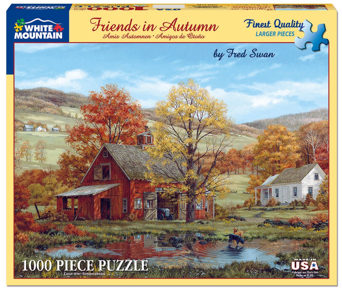 The Friends in Autumn puzzle features an old red barn, which is reflected in a pond where a pair of Labs wade, watched by a cat on the steps of a white farmhouse. Autumn leaves have not yet fallen in the bucolic scene depicted in this puzzle, but you can just imagine the foliage in the crisp fall air. Artist: Fred Swan: 1000-piece jigsaw puzzle: Finished size 24" X 30".Â