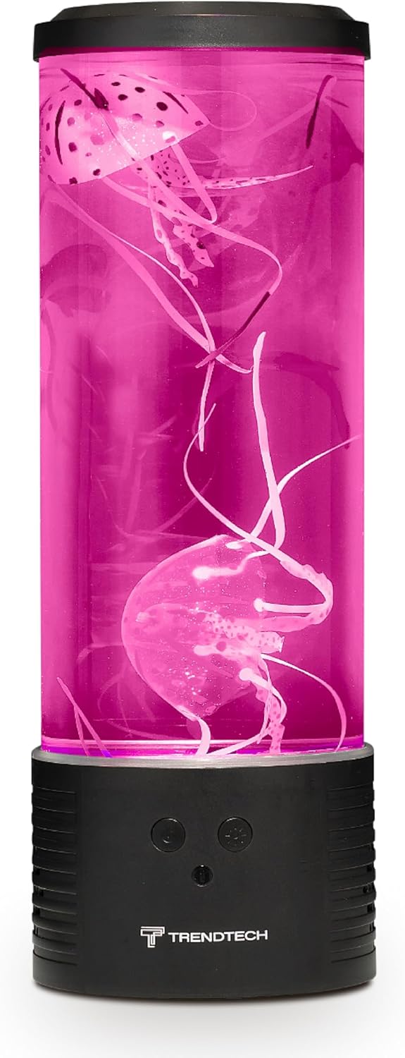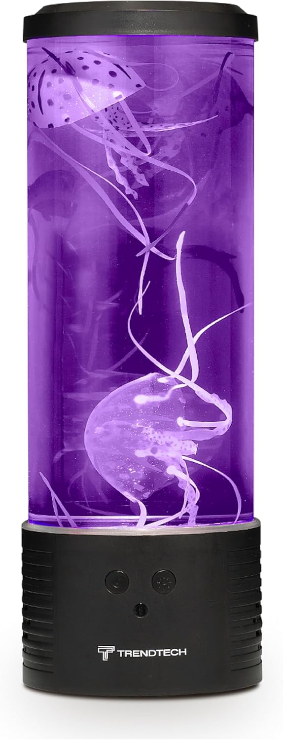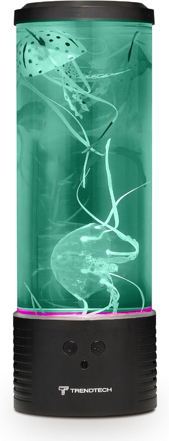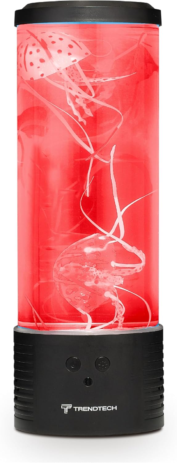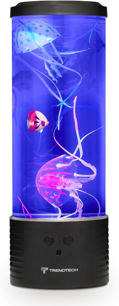 Transform your living space into a mesmerizing underwater sanctuary with the Lumina Jellyfish Mood Lamp. This 14-inch modern lighting masterpiece features incredibly lifelike jellyfish that gracefully dance through the water-filled glass chamber, creating an enchanting visual display that's almost indistinguishable from real marine life. The lamp offers customizable RGB LED lighting modes, allowing you to set the perfect ambiance with a spectrum of vivid colors from soothing blues to warm reds. Enhanced with Bluetooth speaker capabilities and white noise features, this mood lamp creates an immersive multi-sensory experience. The touch-controlled lamp includes convenient features like an auto shut-off timer for worry-free operation. Measuring 6 inches in width and 10 inches in height, this corded electric lamp is designed for indoor use and requires no installation. The metallic finish and clear glass shade complement any room's decor, while the sturdy metal base ensures stability. Perfect for living rooms or any space where you want to create a calming, oceanic atmosphere.