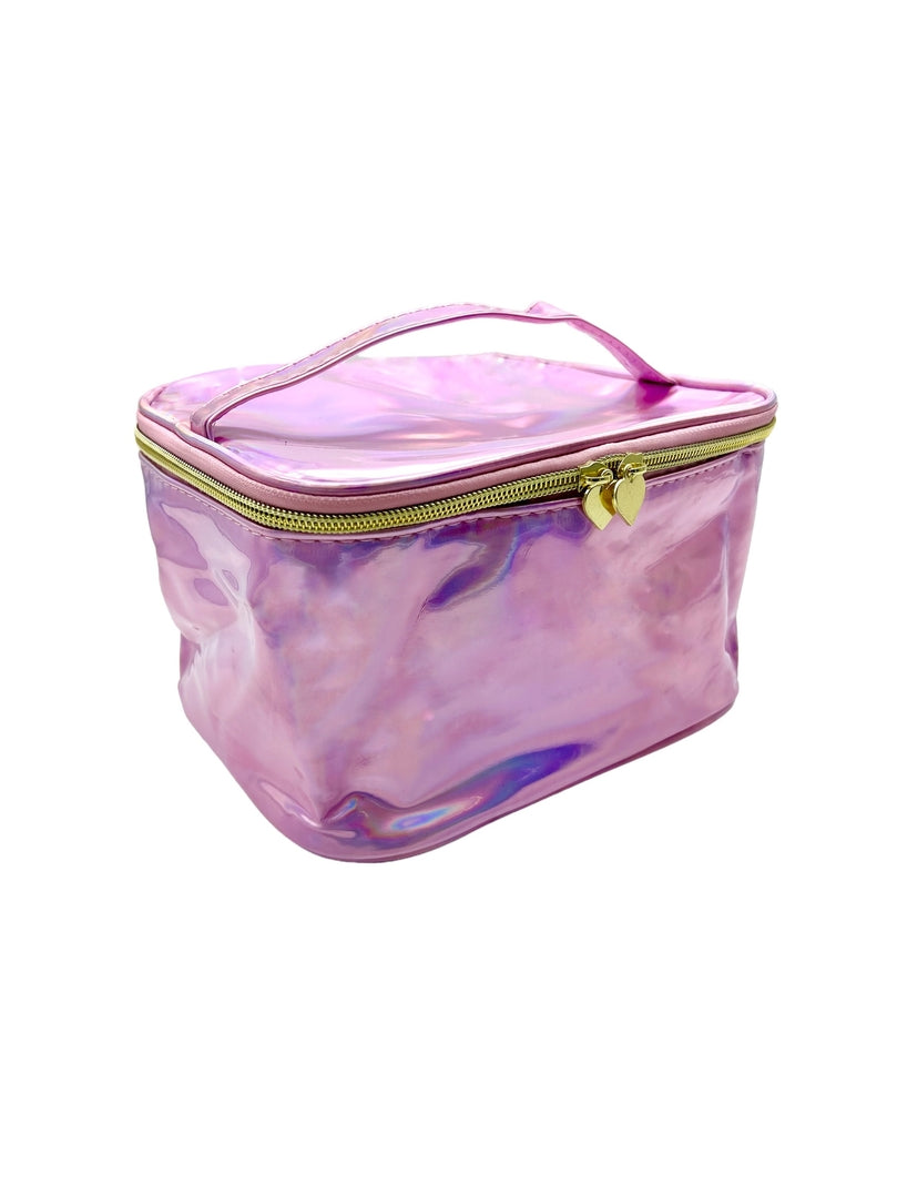 This adorable pink laser bag is a great size for all your essentials! It is lined with waterproof material for cosmetics or great for jewelry! It has two cute gold heart zipper pulls!