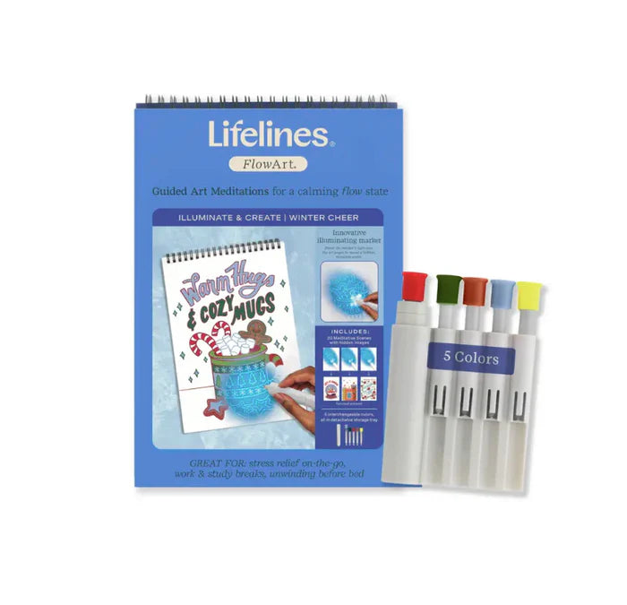 Lifelines FlowArt Pads are guided art meditations designed to help you achieve a calming flow state. Each scene is thoughtfully crafted to encourage repetitive, relaxing movements, promoting mindfulness and reducing stress. UV Art includes 20 meditative scenes and an innovative illuminating marker with 5 interchangeable colors, all in a detachable storage tray. Hover the marker's UV light over the page to reveal hidden, traceable scenes. Experience full immersion into this mesmerizing activity, as the illumination brings captivating detail to life, drops you into your flow, and results in a striking scene. Compact and portable, this pad is perfect for calming your mind on-the-go, unwinding before bed, or taking a work or study break to de-stress.