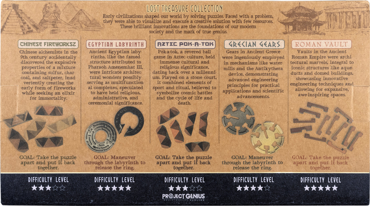 An assortment of five premium brainteasers inspired by ancient civilizations. Each puzzle has a unique solution to offer a diverse range of difficulty levels. Features enhanced packaging with gold-embossed logo for a luxe gift.