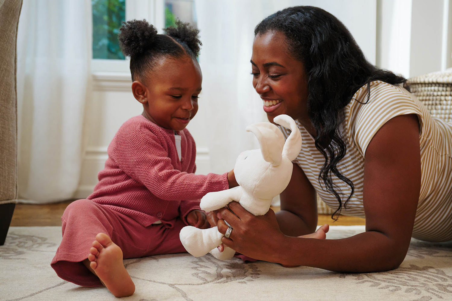 Flora is here in an all-new format! This classic award-winning plush bunny is here in a smaller, travel-friendly size with a simpler squeeze-and-play feature that everyone can use to play peek-a-boo with baby. Simply press her tummy with a gentle squeeze and her ears flop downward, covering her eyes to hide and leaving you in control of the game. Her long ears then pop back up as soon as you release the pressure, letting you decide when the surprise occurs. Flora`s new 7 size and floppy limbs enable her to sit upright for display or let her legs dangle down playfully, making an adorable baby shower gift and cuddly soft toy. This innovative baby toy was also made thoughtfully, with the whole family in mind: with only minimal pressure needed to press her tummy, everyone can play comfortably and easily, from siblings all the way to grandma!