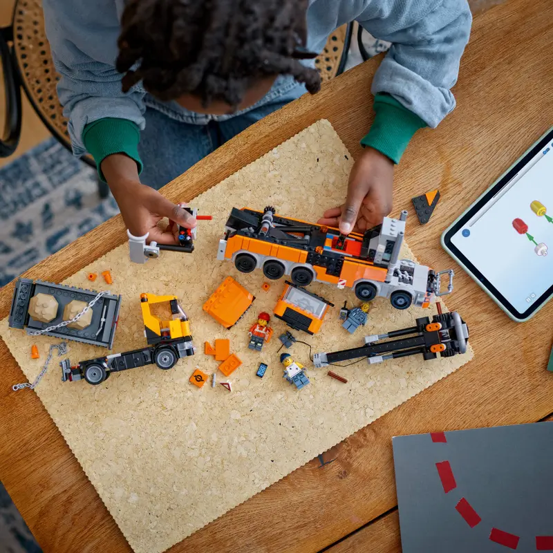 This toy truck playset includes a step-by-step printed construction guide and digital instructions in the LEGO Builder app. Here, kids can zoom in and rotate models in 3D, save sets and track their progress as they build.