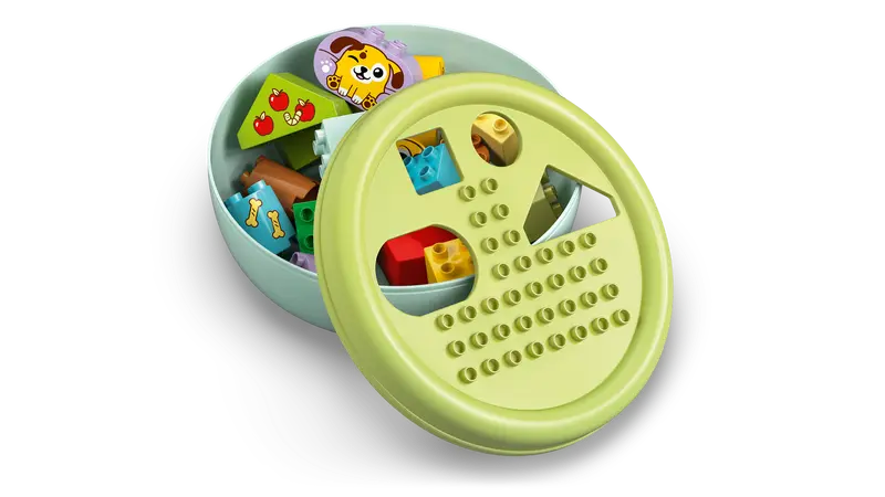 - A fine motor skills toy with double the fun ÃÂâ The colorful brickscome in 4 different shapes, assemble to make a puppy play place or can be taken apart to drop thorough the lid of the doggy bowl