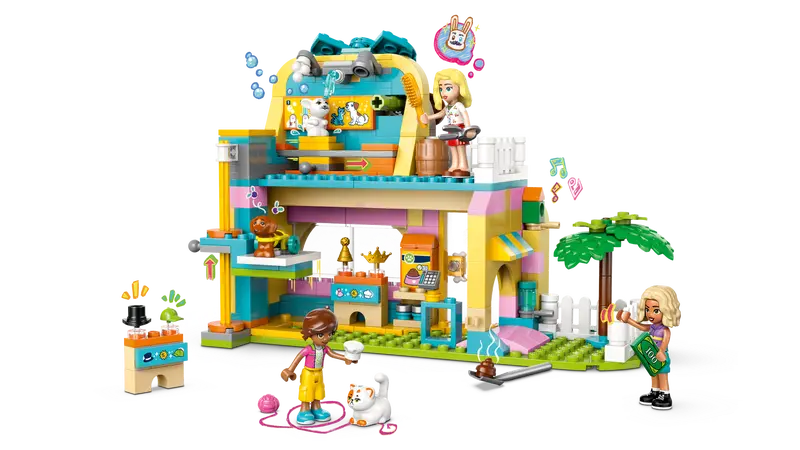 - Pet-grooming toy and pet accessories shop â The dog-shaped two-story building features a pet accessories shop and a grooming station so kids can enjoy hours of fun pampering the animals