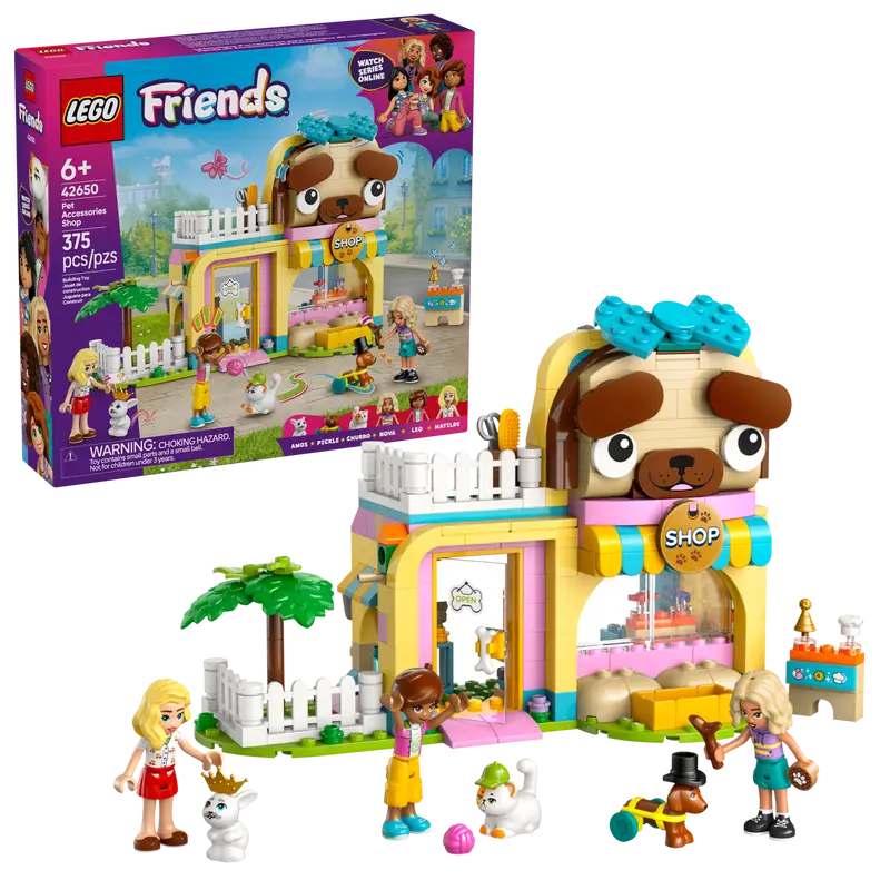 - Pretend-play building set for kids â This Pet Accessories Shop for girls and boys aged 6 and up comes with 3 minidolls, plus cat, dog and bunny figures, and lots of accessories for imaginative play