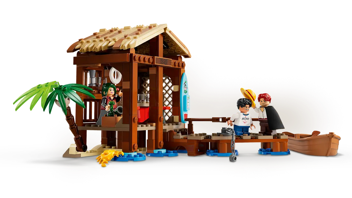 Kids can remove the roof of the beachside store to access its fun-filled interior. Inside, theyll find accessories for running the store and entertaining customers. Theres a Wanted poster to attach to the wall, and space for additional Wanted posters available in other LEGO ONE PIECE models (sold separately). Outside, theres a pirate boat toy attached to the jetty by a chain. The set includes minifigures of Luffy, Shanks and Makino, 3 memorable characters from the Netflix show. For added digital fun, builders can zoom in, rotate models in 3D and track their progress using the intuitive LEGO Builder app. Set contains 299 pieces.