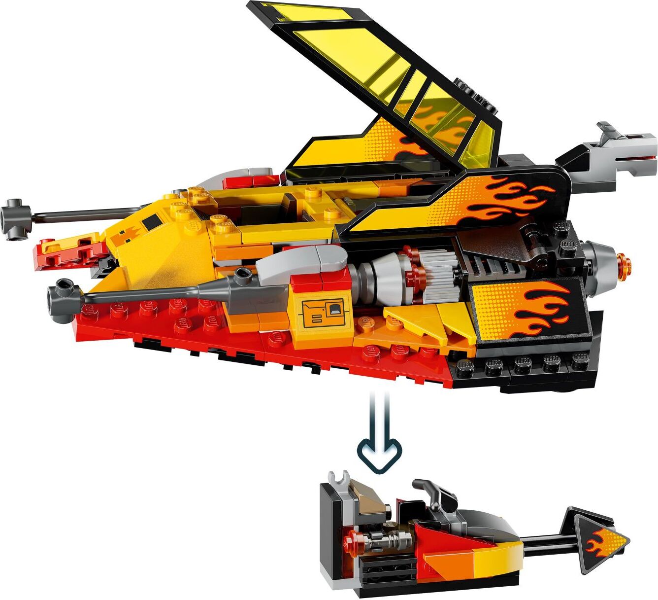 • 2 LEGO® Star Wars™ vehicles in 1 – The Force Burner Snowspeeder features flame decals, an opening double cockpit with a hidden, detachable speeder bike, and a rear stud shooter