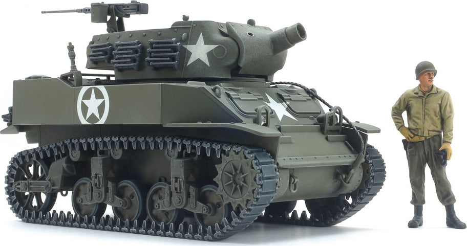 1/48 scale plastic model assembly kit. Length: 92mm, width: 48mm.Features realistic renderings of interior details (such as main gun breech) of turret, plus the howitzer covered by a distinctive sleeve.Assembly type tracks feature one-piece straight sections.Includes two marking options to depict the 106th Cavalry Reconnaissance Group, Germany or the 758th Tank Battalion, Italy.Metal chassis weights give the model a realistic heavy feel.Comes with one full body commander figure.