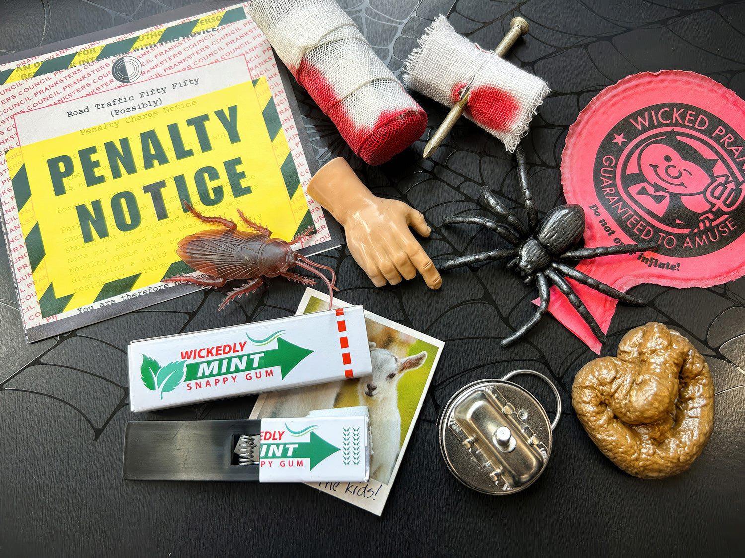 This set includes favorites such as Snappy Chewing Gum, Fake Poo, Bandaged Finger, Metal Hand Buzzer, Cockroach, Creepy Little Hand, Whoopee Cushion, Nail Through Finger, and Parking Notice. A proven hit in toys, novelty gifts, and gag gifts, this kit is simple, effective, and always entertaining.