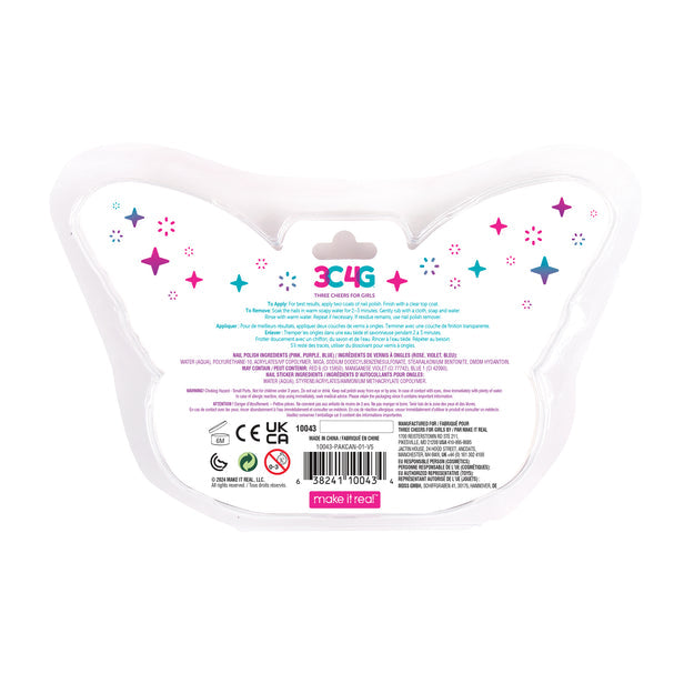 Master at-home manicures with these shimmering nail polish colors and butterfly nail stickers. These 3 glossy polishes are made to mix and match, whether your fashionista sticks to a modern monochrome or paints each nail a different color, the finished look will always be trendy. These high-shine pigments last through playtime and come off simply with nail polish remover to make changing it up easy-peasy. Safe to use, fun to wear, win-win. Whether it’s a birthday bash, playdate or slumber party, these shimmering colors and cute nail stickers offer up the perfect playtime activity for little ones to explore their fun, creative sides. Polish is water-based, comes in 3 8mL glass bottles and is tested for use by children. PERFECT FOR AGE 8+