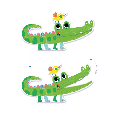 A fun educational puzzle where children recreate an animal and bring it to life by moving parts of its body: the crocodile’s mouth, the monkey’s arm holding a banana, and more! Two-part and three-part puzzles and fun, simple idea association games for ages 2 and up. The large pieces are easy for little hands to grasp, and the storage boxes can go with you anywhere!