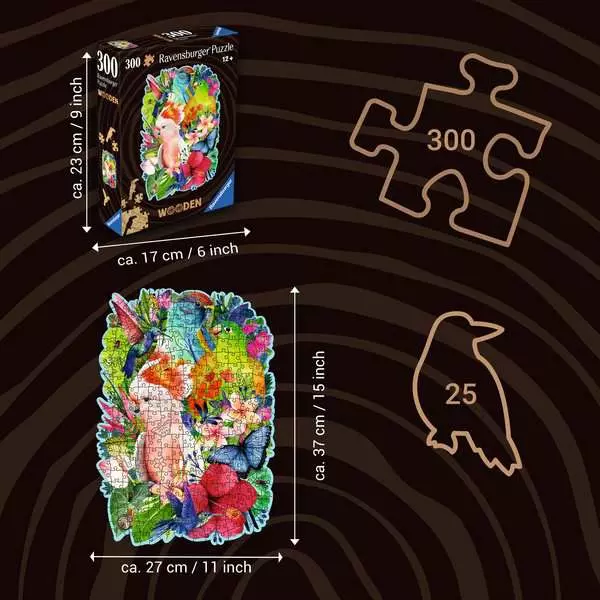 Spend some âme timeâ solving the âBirdsâ Shaped Wooden puzzle! Hand-designed and laser cutted, the quality puzzle features a colorful illustration printed directly on the wood. Inspired by the image, 25 delightful WHIMSIES are incorporated within! Made of eco-friendly engineered wood and packed in a paper bag, this sturdy puzzle makes a nice and sustainable gift.