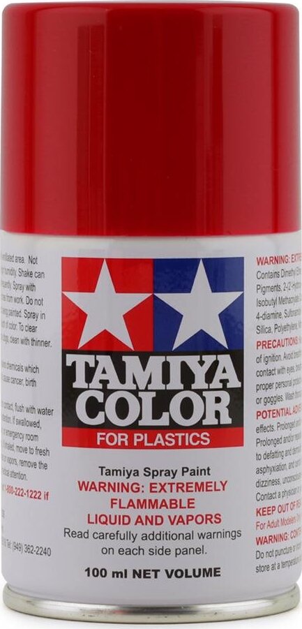 Tamiya Color TS-95 Pure Metallic Red Spray Paint works well on wood, styrofoam and most common model plastics. Paint is a synthetic lacquer and can holds enough paint to cover 2 or 3 standard car models. Ages 14 and up. Made in Japan. 100 ml (3.38 ounce) spray can. ATTENTION: This product contains chemicals known to the State of California to cause cancer, birth defecTS- or other reproductive harm.