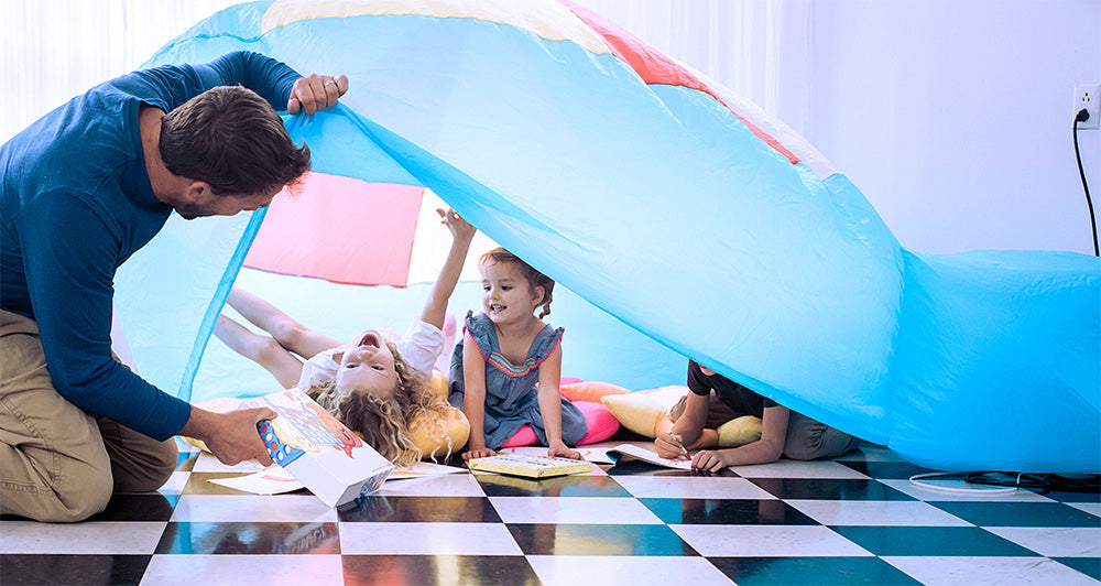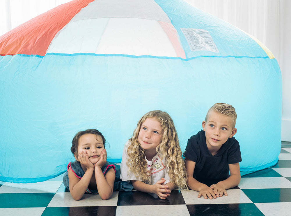 Kids love to make forts. Parents aren't always thrilled to clean up homemade forts. Enter Airfort! Airfort inflates in about 20 seconds using a standard box fan (not included). Its made of polyester fabric and has a mesh panel to keep kids away from the fan. It has no doors or windows - you enter by lifting the edge of the Airfort crawling under. Its spacious inside 50" tall at peak and 77" wide. When kids are done playing turn the fan off and AirFort deflates and can be folded down into a 15" x 10" box. Available in Beach Ball, Digital Camo, Gray & White and Pink & White