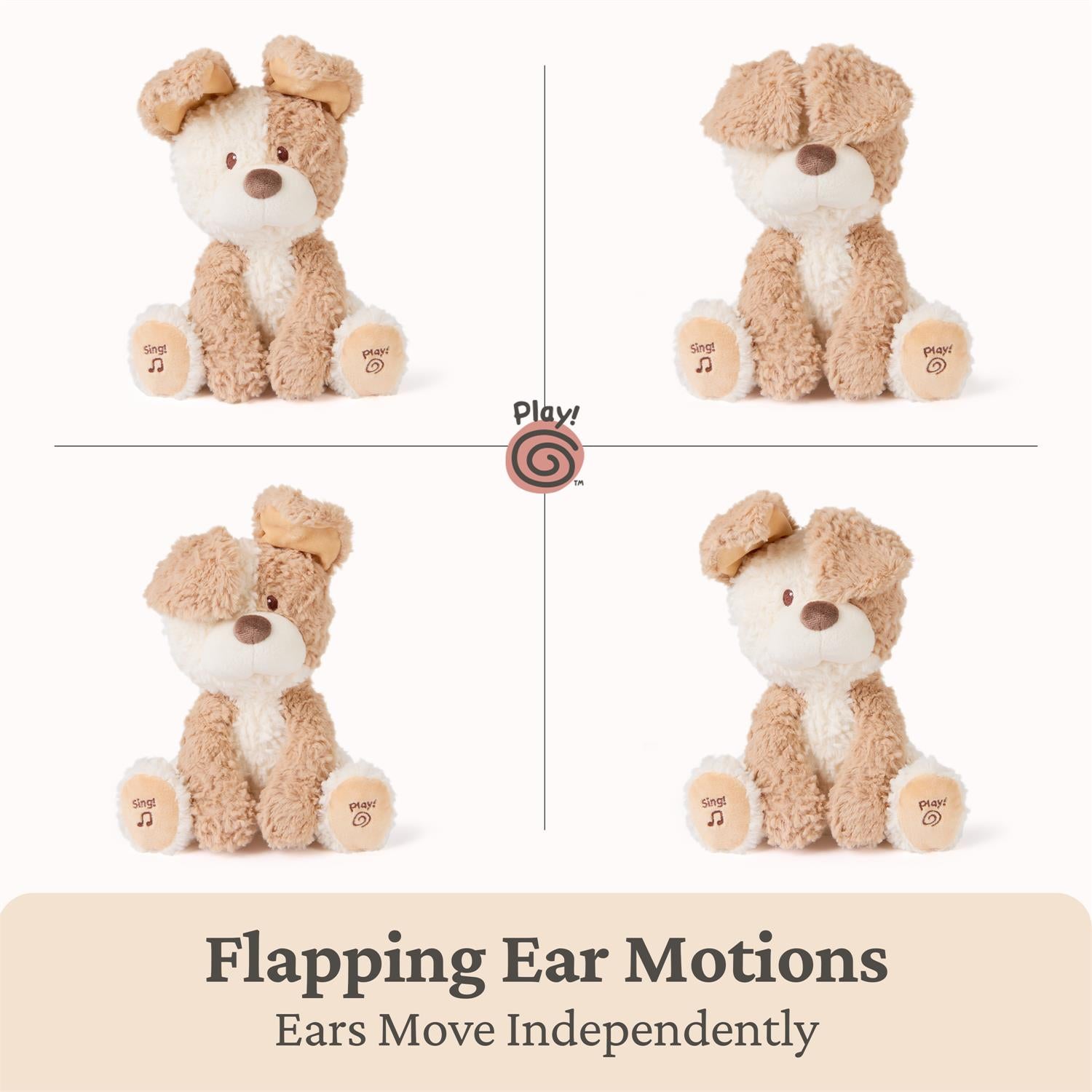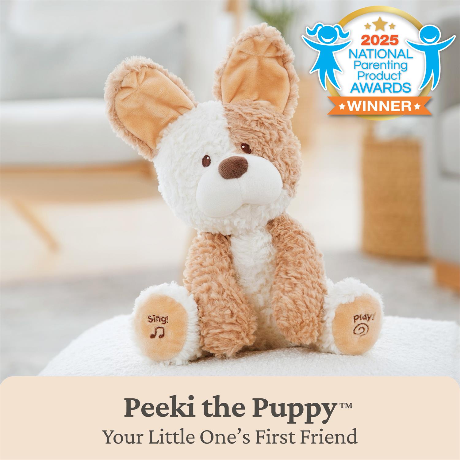 GUND Baby is proud to introduce Peeki, the peek-a-boo puppy! This innovative, oh-so-cute spotted puppy is the latest addition to the GUND Baby animated plush collection, turning playdates into fun, tactile, snuggly exploration sessions. As soon as Peeki`s switch is turned on, it comes to life and greets Baby in a cute child`s voice, asking if they want to play peek-a-boo. Then parents and siblings can press one of Peeki`s paw pads to activate an engaging game or song to entertain baby. Press Peeki`s right paw to begin a fun, silly game of peek-a-boo! Peeki uses its short, floppy ears to cover its eyes and hide, occasionally taking a peek at baby with just one ear. Then, for a fun surprise, press Peeki`s left paw pad - Peeki sings a unique peek-a-boo song!