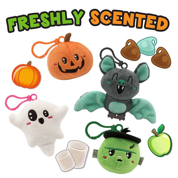 Backpack Buddies Spooky Squad are scented stuffed plush that come attached with a backpack clip. There are 4 unique characters all with their own unique scent. Each Backpack Buddy is filled with super soft stuffing and gourmet scented beads.