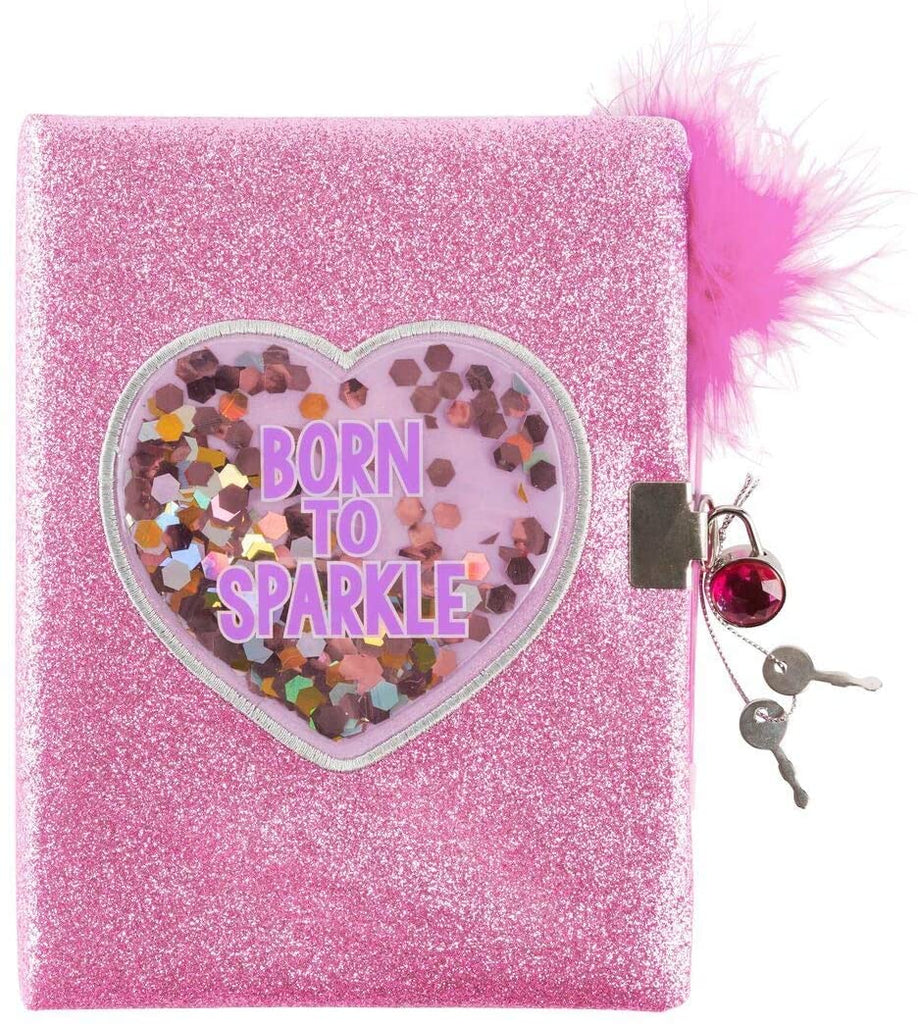 This sparkling glitter journal features a heart applique with floating sequins, a sparkling gem lock, and a feather pen.