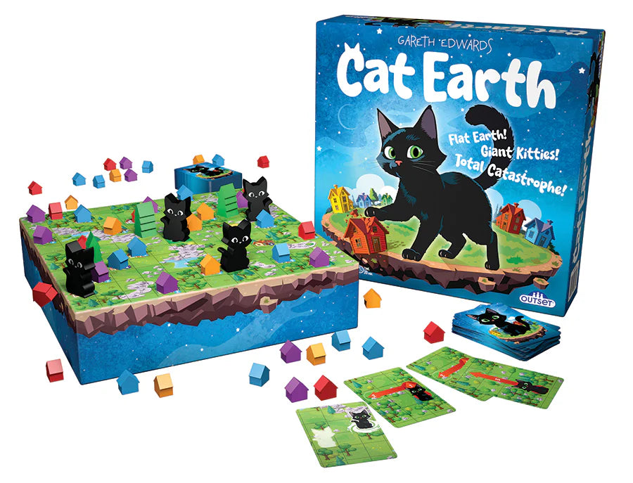 If the Earth was flat, what would cats do? Knock stuff off the edge of course. In Cat Earth, giant mischievous cats roam a flat world, knocking houses into the abyss, as players use movement cards to control the cats. Includes wood meeples and a pull-out box to use as the playing surface.