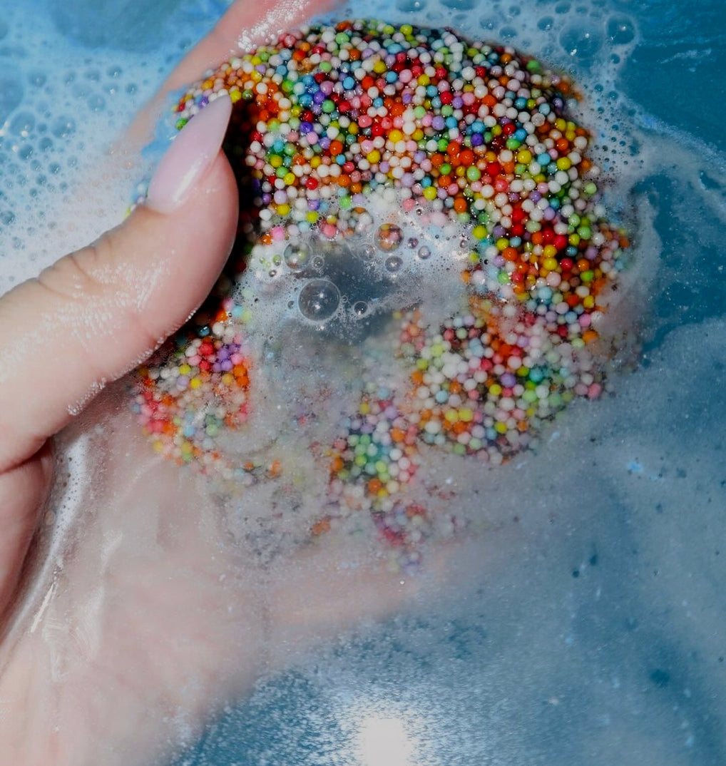 Hand-pressed with Epsom salt and shea butter. Sweet, fun, and safe for all ages. Made with natural ingredients. Floral scented. Topping and color may slightly vary.