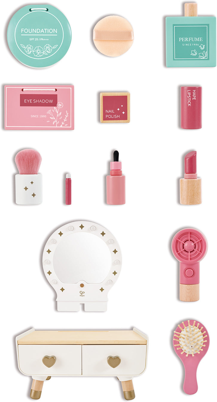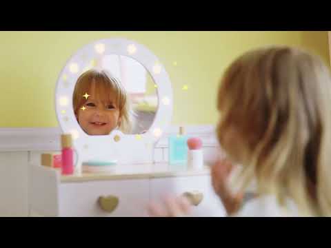 Give a memorable gift that fosters creativity as children immerse themselves in pretend play makeup artistry. There are so many ways for ages 3-8 to play with this compact, desktop wooden vanity: turn on the mirror lights to illuminate smiles and pull the wooden accessories out of the drawers. Kids can comb their hair, pretend to apply makeup and perfume, and press the button on the hair dryer to hear it whirr. Encourage self-discovery through exploration of self-care routines, building confidence and self-awareness. Requires 3 AAA batteries, not included, for mirror lights and 2 cell batteries, included, for hair dryer.