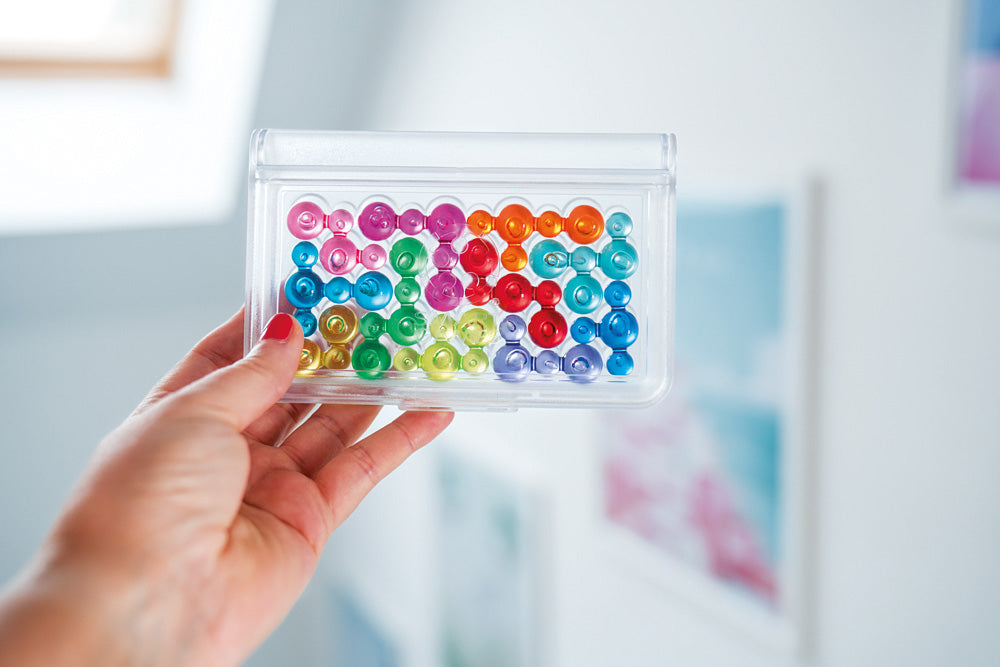 Burst the boredom bubble with a new IQ game that's pop-ular with clever kids and adults! Designed in a compact format with lid to take and play wherever you go, it's satisfying screen-free entertainment. Choose one of the 120 challenges and place the translucent bubbly pieces as shown. Solve the challenge by filling the grid with the rest of the pieces. Each puzzle only has one solution! For 1 player.