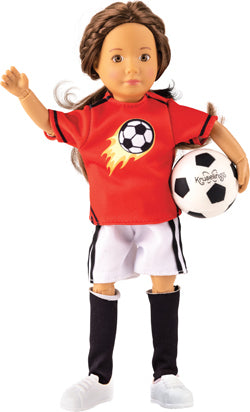 This is the Kruselings doll Sofia in the soccer court. Sofia wears a T -shirt, sport pants, crops, sneakers and she brings her own hairbrush. Sofia carries her favorite soccer ball, and is ready to shoot. Sofia is a 9 in. doll of high quality vinyl, with movable joints and life-like looking glass eyes. Suitable for children 36 months and over.