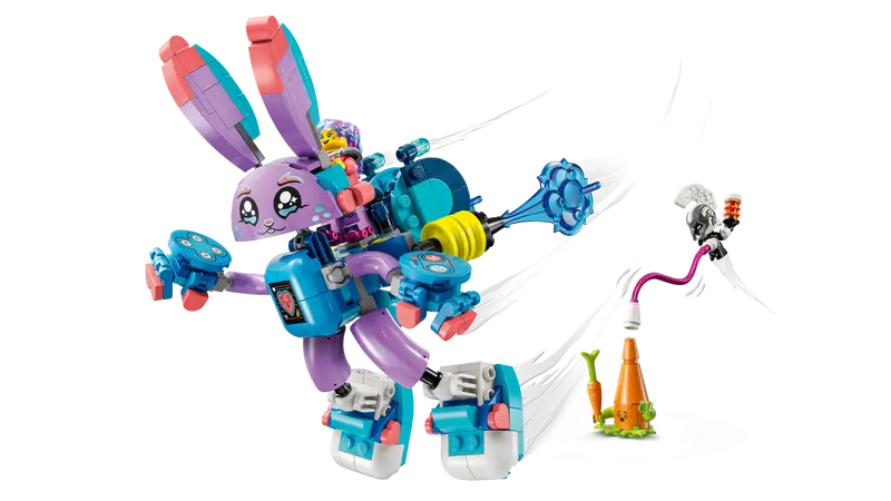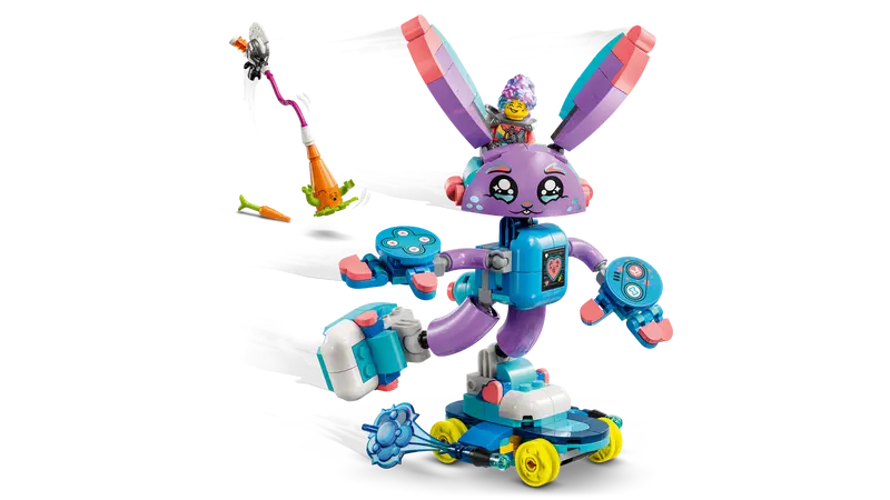 Young dreamers will have fun building the Bunchurro figure, a cool new version of Bunchu the Bunny that has a video game screen on its belly and wears gaming controller gloves and sneakers, before discovering 2 ways to transform it. They can accessorize the rabbit model with a skateboard and boosters or an awesome jetpack. The toy rabbit is highly posable in all modes, and the action is brought to life by an Izzie minifigure, who attaches to the back of Bunchurro to encourage imaginative role play.