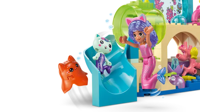 This LEGO Gabbys Dollhouse playset is packed with vibrant features and familiar characters, including a Gabby minidoll in her mermaid outfit, and MerCat and Jellyfish figures. Kids can join Gabby and her pals to explore a colorful underwater environment filled with shells, plants and sea life. Theres lots to discover, including a slide, a giant bubble that MerCat can “float” in, and coral that moves to reveal a hidden treasure chest. The set comes with colorful pictorial instructions, a large Starter Brick and separate bags containing 1 buildable model per bag to make creative construction fast and fun for little builders.