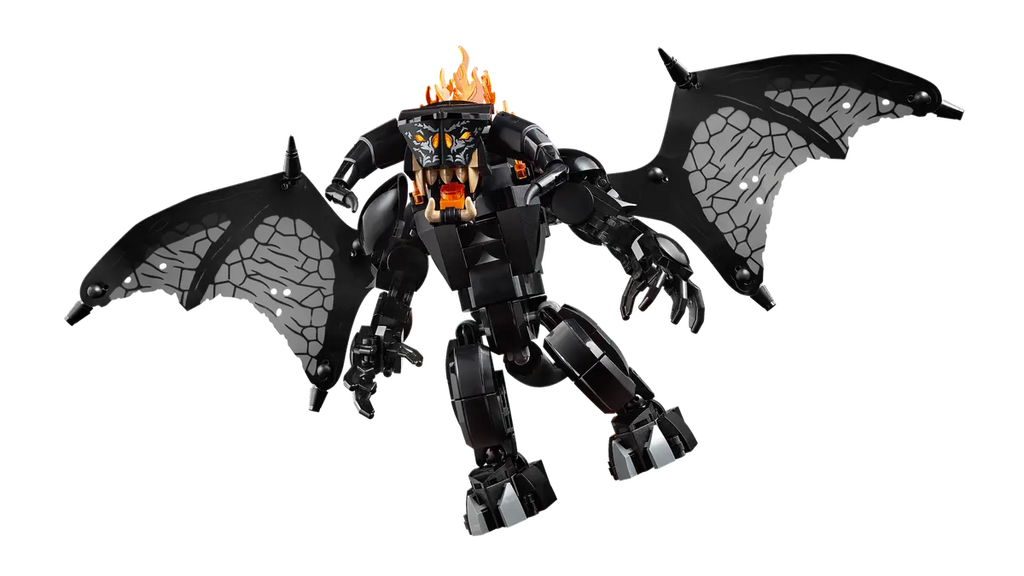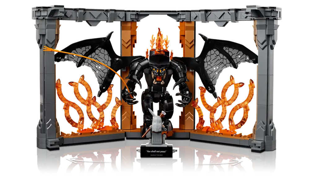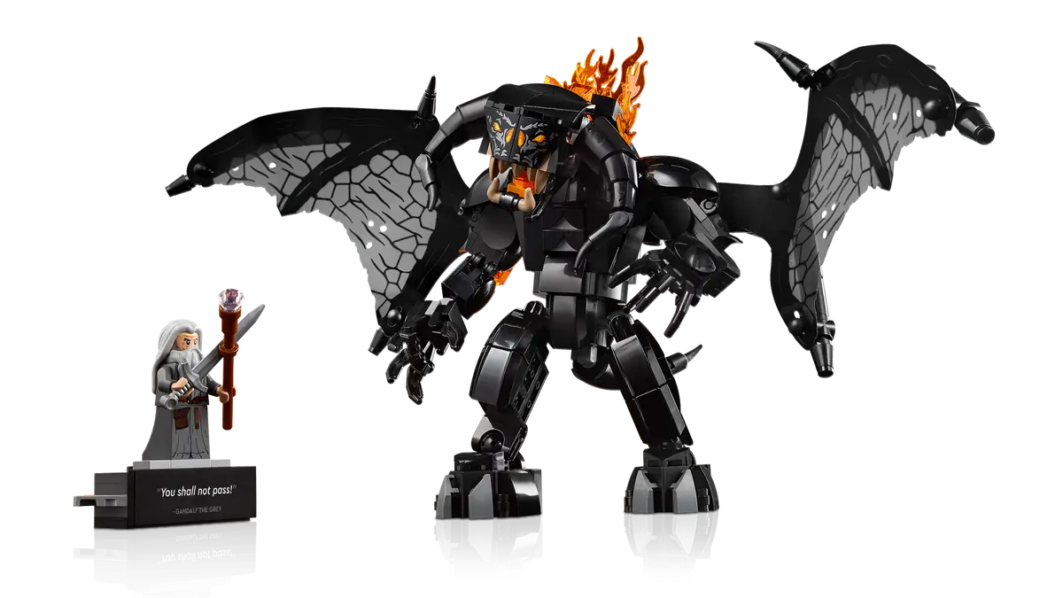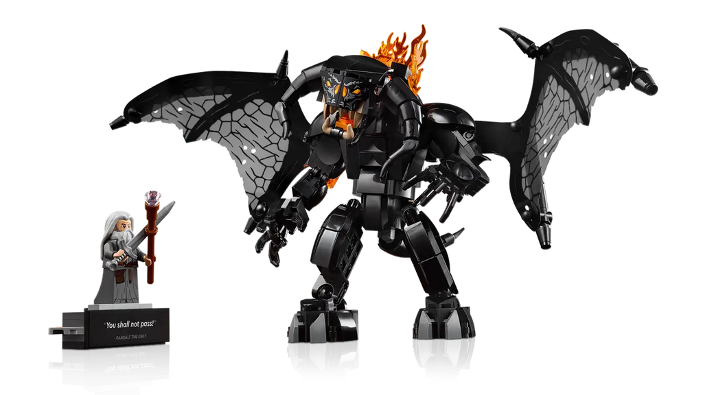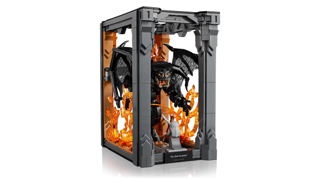 Bearing a plaque with the words You Shall Not Pass, the model depicts Gandalf the Grey in a fearless stance and the Balrog with its mighty wings unfurled against a blazing wall of flames. Both characters are detachable and the Gandalf minifigure has a staff and sword, while the Balrog figure wields a fiery whip and features posable limbs and wings for dynamic display.