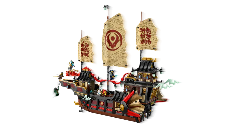 • Interactive ship playset – NINJAGO fans turn a gear to move the sails, remove roofs and floors to gain access to the interior and a sushi bar, and fold a table in the main cabin to reveal a secret