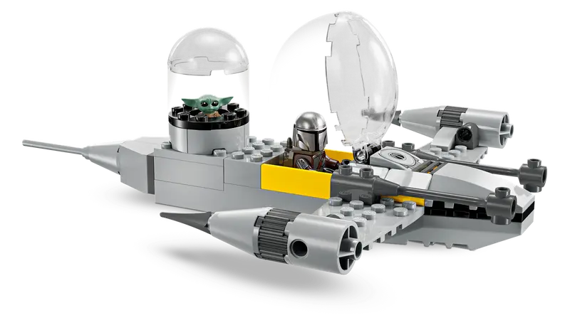 This N-1 Starfighter model building kit includes 3 LEGO Star Wars characters: The Mandalorian with a darksaber and jetpack accessory element, Grogu with a hover pram, and R5-D4. Place The Mandalorian in the N-1 Starfighterâs opening cockpit, and put Grogu in the passenger space at the rear.