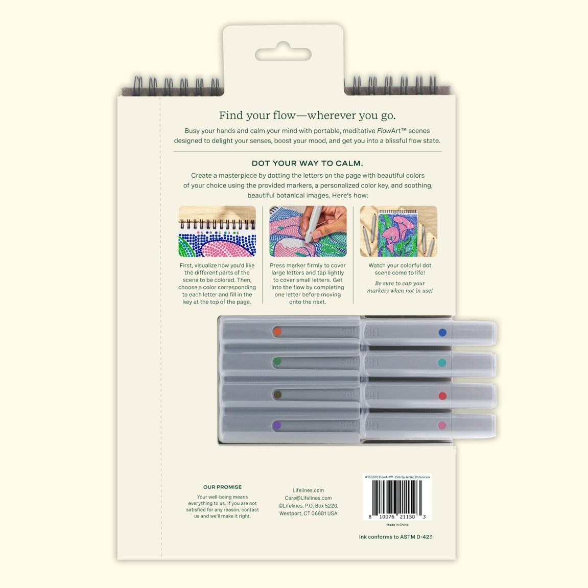 Lifelines FlowArt Pads are guided art meditations designed to help you achieve a calming flow state. Each scene is thoughtfully crafted to encourage repetitive, relaxing movements, promoting mindfulness and reducing stress. Dot-by-Letter includes 20 meditative scenes and four double-sided markers in a detachable storage tray. Engage in a meditative dotting activity using a guided letter key to fill the page with vibrant dots, creating beautiful botanical scenes. Simply match the colors to the letters, and let the rhythmic motion of dotting bring you a sense of calm. Compact and portable, this pad is perfect for calming your mind on-the-go, unwinding before bed, or taking a work or study break to de-stress.