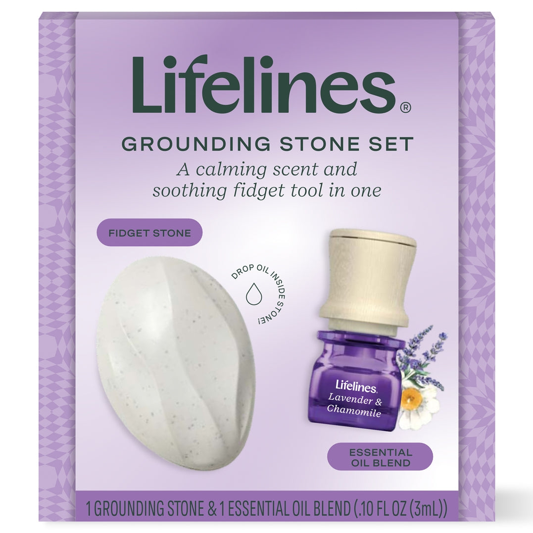 Lifelines Grounding Stone Gift Set: Combine the calming sensory act of fidgeting with scent to help you feel more present and focused. Includes 1 Grounding Stone and 1 In Bloom Essential Oil Blend. Makes a thoughtful holiday gift and feel-good stocking stuffer!