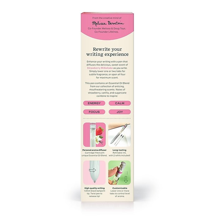 Shake up your sensesâno straw requiredâwith the Lifelines Pen Diffuser in Strawberry Milkshake. This feel-good pen brings the sweet, creamy scent of strawberry and vanilla to your everyday writing. Featuring a smooth 1.0mm black ballpoint tip, a comfortable grip, and adjustable scent vents, you can control the level of aroma with every word. With long-lasting ink and two ink refills included, it's a delightful gift for teachers, students, coworkers, or anyone who loves a fun twist on the ordinary. Made with pure essential oils and botanicals and no parabens, phthalates, or dyes.