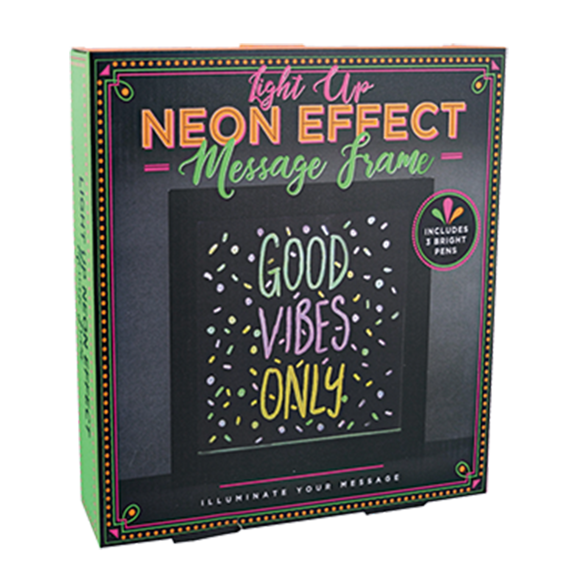 Live brightly all day – and all night! – with this fun, customizable neon effect frame light. What better way to add brightness to that dark corner or shelf than with a fun light that beams your choice of saying with a neon-bright glow! Simply write or draw on the glass-encased in the light-up frame, with the three neon-colored pens included with the light. Keep it fresh by wiping off the glass any time you want to change your message! Set the frame in your favorite spot and bask in the glow of your personalized message of inspiration every day! Frame light measures 9.18″ wide x 9.25″ tall and runs on 3 AAA batteries, not included.