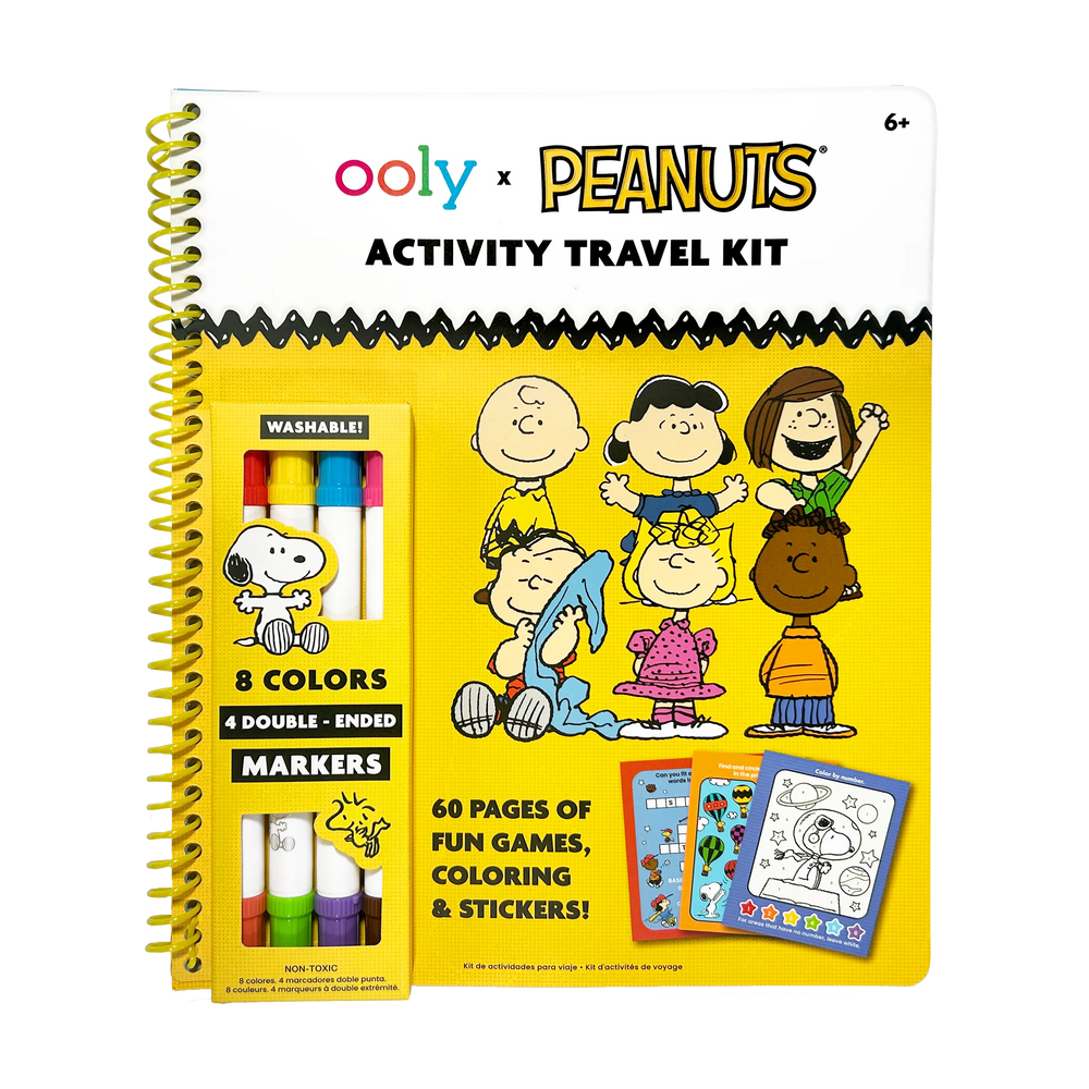 Hours of fun can be had with the OOLY x Peanuts Activity Travel Kit featuring Snoopy, Charlie Brown, and the Peanuts gang! Packed with a 60-page activity book full of puzzles, games, and coloring sheets, this travel kit is perfect for kids who love the Peanuts gang’s adventures. The set includes 4 double-ended markers with 8 colors and 2 sheets of Peanuts-themed stickers. With these travel games for kids, you can help Linus find his blanket or color Snoopy’s next big adventure. This activity kit is full of fun for kids and Peanuts fans of all ages.