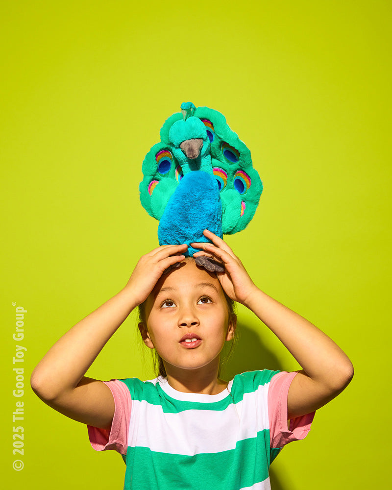 This beautiful bird is an absolute showstopper with his vibrant, multi-colored feathers and elegant design. His soft, velvety body is a gorgeous shade of sapphire blue, and his wings are a rich teal accented with colorful feather details.