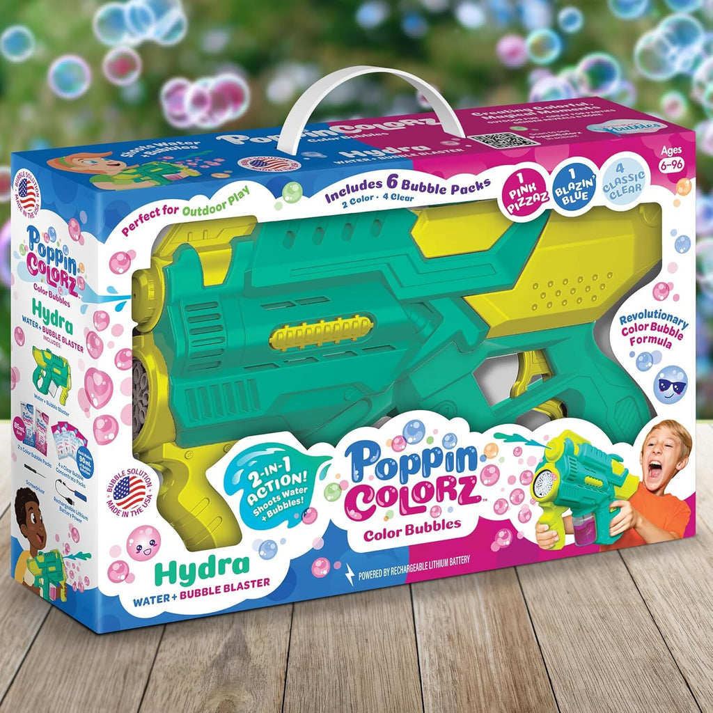 Introducing PoppinColorz Cozmic Light-Up Color Bubbles Blaster, with bubbles that are proudly made in the USA! With 1 Pink, 1 Blue, and 2 Clear Bubble Solutions, the fun never ends. No dipping needed with its easy click trigger, perfect for small hands.