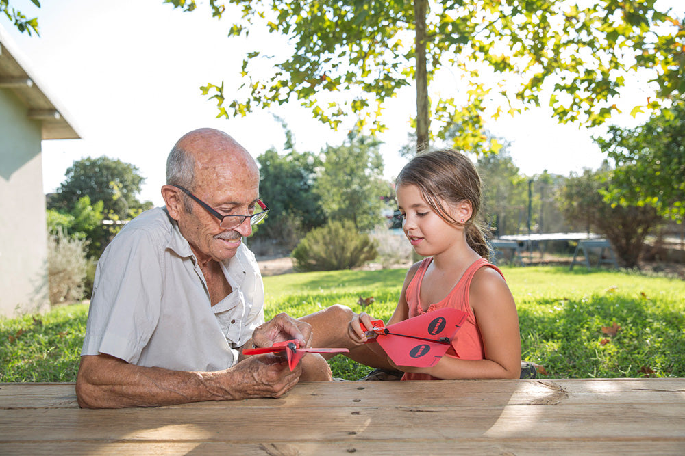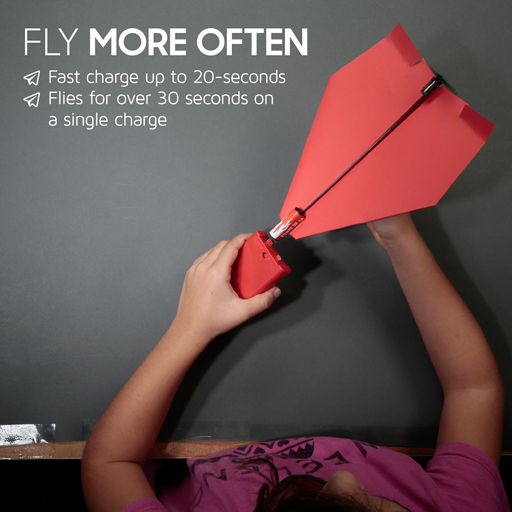 This was the best thing we saw at Toy Fair last year! It's the world's first electric-powered paper airplane! Make a paper airplane that flies well, clip on the Power Up Power Kit and your creation can fly for 30 seconds or more after a 20 second charge with the included charger. Includes power module, instructions, charger and spare propeller. To save weight, the power module is made from lightweight carbon fiber and uses a capacitor, not batteries, to power the micro electric motor. Use outdoors only when wind is 5 mph or lower. Requires 3 AA 1.5V Alkaline batteries (not Included). Ages 8 + up. Imported. Insider tip: Make sure your airplane flies straight with the power module attached before charging the motor. If it doesn't glide well without power, it won't fly well when power is added.