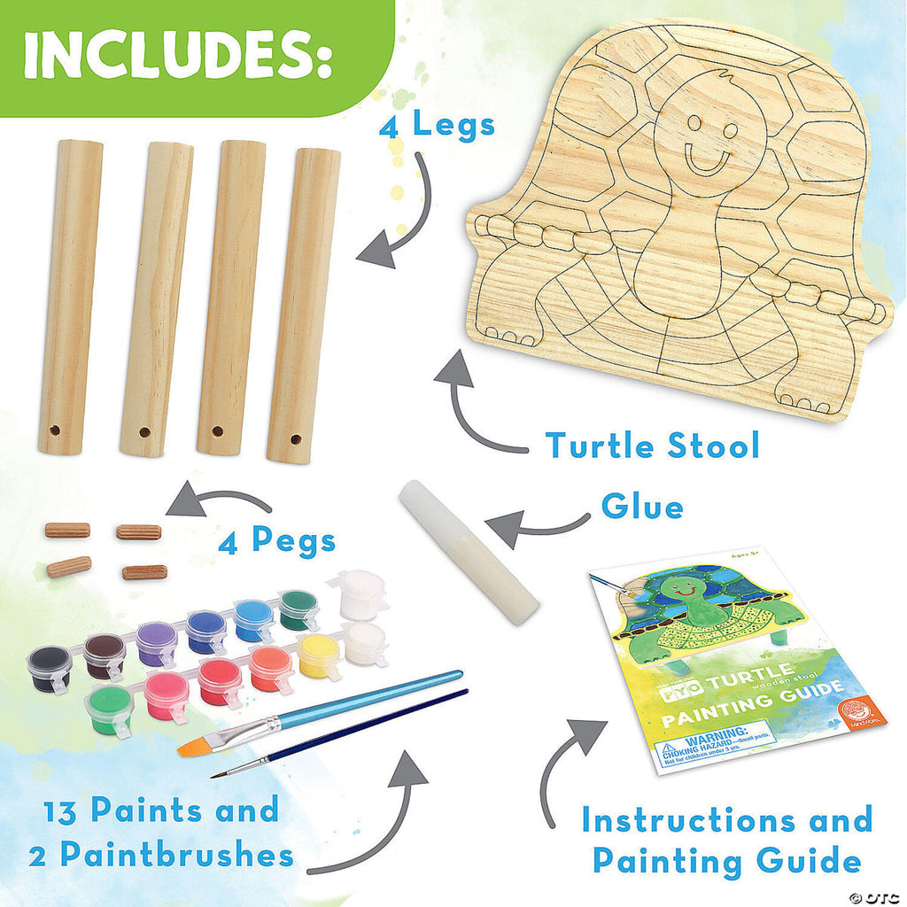 This sturdy, paintable stool sparks imagination while adding functional beauty in any space! Shaped like a turtle and ready to be painted or decorated with your personal touch, this wood stool is not simply a colorful seat but can also serve as a charming decor item, book stand, plant holder and more. A fantastic project for family craft nights, birthday parties or solo art sessions, this fun and functional canvas is a great way for artists of all ages to showcase their creativity and style! Simple assembly to attach the legs. No tools needed.
