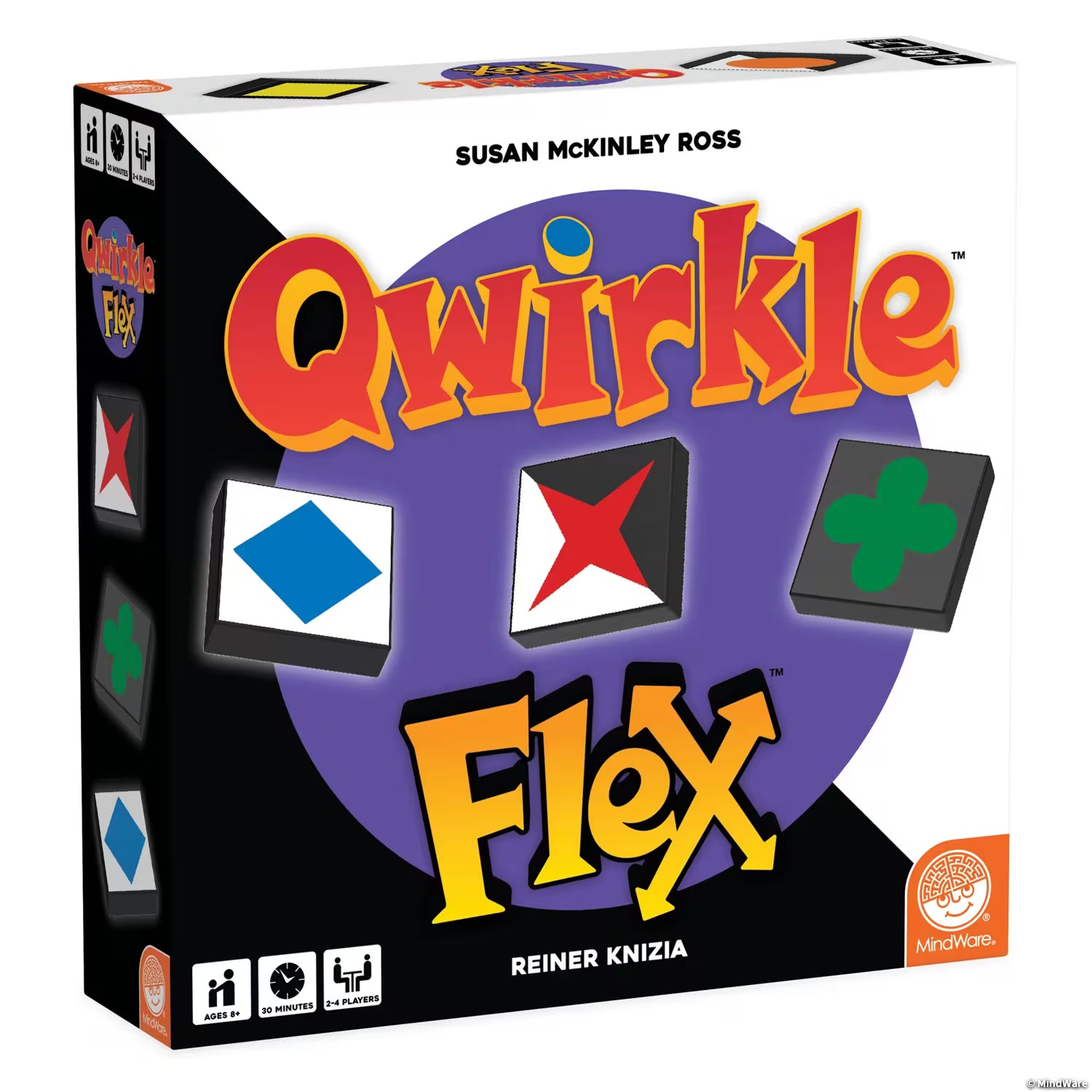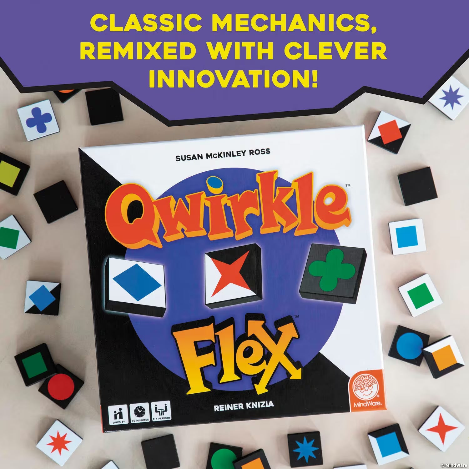 Flex your scoring muscles with Qwirkle Flex, a bold new twist on the award-winning tile game that will take your strategy in a whole new direction! This fresh remix from legendary game designer Reiner Knizia adds an exciting new layer to the game. Tiles with three different backgrounds create surprising opportunities to score diagonally. Points add up quickly when you place even one tile that scores in multiple directions. Adjust your focus from foreground shapes to background colors for the thrill of next-level maneuvers.