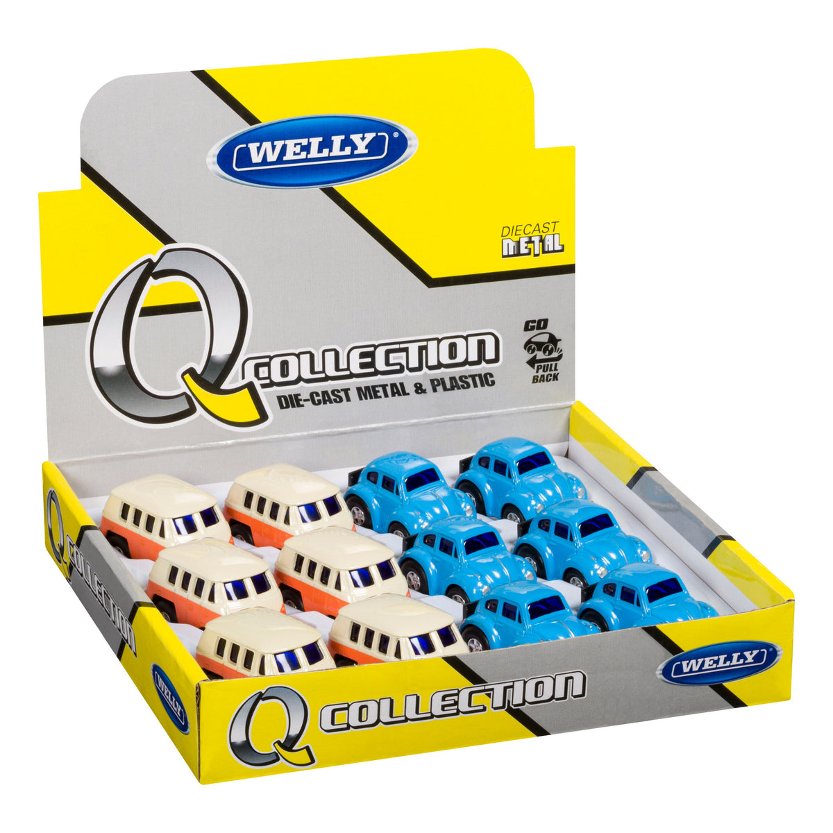 Modeled off classic Volkswagen models, this Welly Q Collection of miniature toy cars includes 2 Volkswagen vehicles. These tiny 2-inch-long toy cars are made with high-quality die-cast metal and plastic materials. Each one has pull-back motion for immediate driving action.
