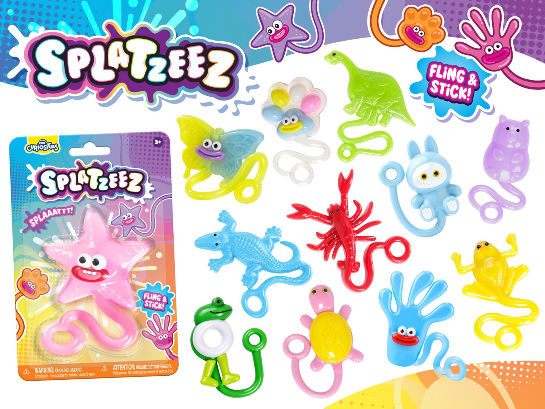 Stretch, fling, and watch them splat! ORB Splatzeez are colorful, squishy creatures that stick to walls and surfaces for hilarious, active fun. Perfect for fidget play, party favors, and collecting—just toss, stick, and repeat for endless entertainment.